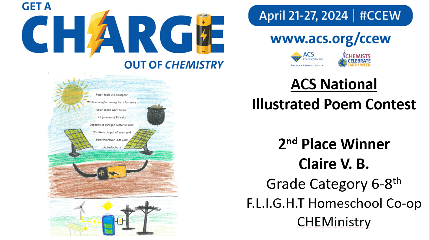 Midland ACS congratulates the winners of our Chemist Celebrate Earth Week (CCEW) Illustrated Poem Contest! Claire V. from Woodcrest Elementary, Shyam R. from Chestnut Hill Elementary, Kaitlyn V. from Woodcrest Elementary, Davarrion R. from F.L.I.G.H.T Homeschool Co-op CHEMinistry, Claire V.B. from F.L.I.G.H.T Homeschool Co-op CHEMinistry, Liam R. from F.L.I.G.H.T Homeschool Co-op CHEMinistry, Stephen T. from Freeland High School, and Wyatt H. from Freeland High School! This year’s theme was “Get a Charge out of Chemistry”