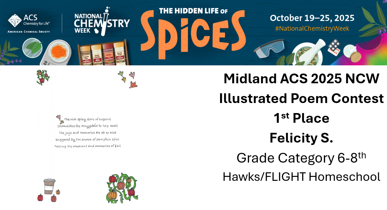 The Midland Local Section of the American Chemical Society (ACS) is sponsoring an illustrated poem contest for students in kindergarten through 12th grade. Write and illustrate a poem using the NCW theme – The Hidden Life of Spices Contest Deadline: Sunday October 26 th , 2025